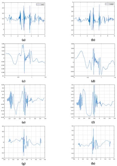 Detection probability of multiple hand gestures: (a) I-data of raw data; (b) Q-data of raw data; (c) I-data of the first hand gesture; (d) Q-data of the first hand gesture; (e) I-data of the second hand gesture; (f) Q-data of the second hand gesture; (g) I-data of the third hand gesture; (h) I-data of the third hand gesture.