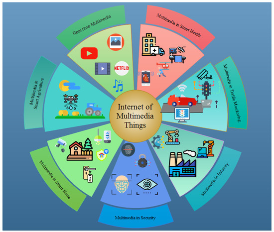 IoT characteristics support multimedia communications; however, multimedia applications are bandwidth-hungry and delay-sensitive. The rapid growth of multimedia traffic in IoT has led the way to innovating new techniques to meet its requirements. IoMT devices require higher bandwidth, bigger memory, and faster computational resources to process data. Typical communications include multipoint-to-point and multipoint-to-multipoint scenarios. Real-world multimedia applications include emergency response systems, traffic monitoring, crime inspection, smart cities, smart homes, smart hospitals, smart agriculture, surveillance systems, Internet of bodies (IoB), and Industrial IoT (IIoT). Dynamic networks, heterogeneous devices and data, strict QoS, and delay sensitivity and reliability requirements over resource-constrained IoMT pose humongous challenges for multimedia communication in IoT. Network-on-chip architecture [18,19] is one of the viable solution to improve the user quality of experience. Figure 2 shows versatile IoMT applications.