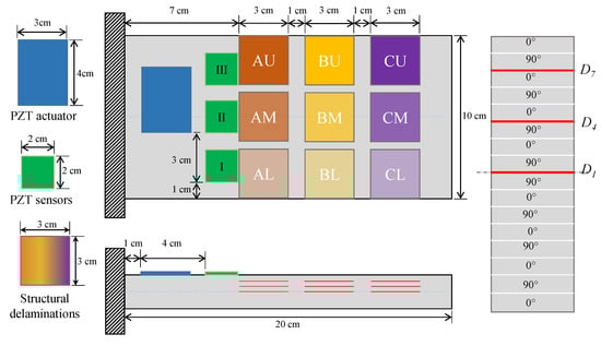 In Figure 1, the symbols AM, BM, and CM denote the inner delaminations, whereas AL, AU, BL, BU, CL, and CU refer to the cases of edge delaminations. The inner and edge delaminations could occur at three different interfaces of D1 (mid-plane), D4, and D7 through-the-thickness of the smart plate. The in-plane delaminations combined with through-the-thickness interface are named by adding the respective interface number with the name of the in-plane location. For example, AL1 means the presence of delamination at the AL in-plane location and at the D1 interface. The smart plate without any defect is referred to as the ‘Healthy (H)’ case. The nine in-plane delaminations combined with three options of through-the-thickness interfaces add up to 27 cases of delaminations in the smart plate.
