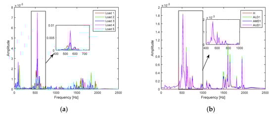 The frequency spectrum of the transient responses in Figure 2a shows that random loadings stimulated multiple modes of vibration and caused more variability in the transient response of a single case (AL1). On the other hand, the variations caused by different damage cases (Figure 2b) is very subtle for different cases of in-plane delaminations and would further decrease for different interfaces of delaminations. The comparison of Figure 2 shows that conventional time and frequency domain discriminative features (e.g., mean, kurtosis, variance, skewness, etc.) could not be employed to discriminate the healthy plate from the delaminated plate.