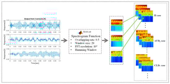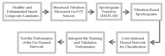 The frequency spectrums in Figure 2 show that the structural vibration responses from the healthy and delaminated smart composite plates are more influenced by operating conditions than the delaminations in the plate. The randomness of loadings hinders the use of statistical time domain and frequency domain features for distinguishing the healthy case from the delaminated cases as well as a distinction between different cases of delaminations (e.g., AL1, AL2, AL3, AM1, etc.). Deep learning offers a natural solution to the current problem due to its capability to automatically extract discriminative features from the input images []. Figure 3 shows a schematic of the deep learning-based methodology for the current problem.