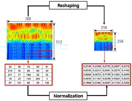 The original size of each spectrogram was 768 × 512 × 3 (width × height × number of channels) with the pixel values between 0 and 255. To reduce the computation cost of the deep learning algorithm and remove the divergence from the pixel values, each one of the three spectrograms was reduced to 256 × 256 × 3 (width × height × number of channels) and normalized to a pixel value between 0 and 1 as shown by Figure 5.