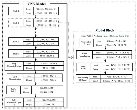 The data set of vibration-based spectrograms consisted of one healthy case (H) and 27 cases of inner and edge delaminations in the smart laminated composite plate. Based on the applied random harmonic loads, each one of the 28 cases is comprised of 1000 instances. From the discussion in Section 4, each instance consists of 3 RGB spectrograms for one random load. The 28,000 spectrograms were split into 22,400 (80%) spectrograms for training, 2800 (10%) for validation of the network during training, and 2800 (10%) were used for evaluating the testing performance of the pre-trained network. A block diagram of the convolutional neural network used for the classification of vibration-based spectrograms is shown in Figure 6.