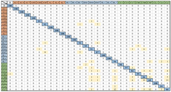 Herein, the labels in the first column denote the ground truth or actual classes, the topmost row shows the labels predicted by the pre-trained convolutional neural network, the numbers on the main diagonal represent the percentage of correctly classified instances, and the off-diagonal shows the percentage of incorrectly classified instances. It is worth noting that delamination at the mid-plane interface shows more noticeable effects in terms of stiffness change and dynamic response characteristics than delamination of the same size near the free surfaces (away from mid-plane) [,]. In addition, due to the high strain near the fixed end of the cantilever plate and proximity of the piezoelectric sensors, delamination near the fixed end would more pronouncedly affect the dynamic response than delamination of the same size near the free end of the smart plate. The test confusion matrix of Figure 7 reveals the following results: