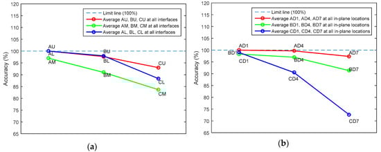 For the in-plane location of delamination (Figure 8a), it is observed that the inner delaminations (AM, BM, CM) are difficult to detect compared with the edge delaminations (AU, AL, BU, BL, CU, CL). Owing to the boundary condition of inner and edge delaminations, the result is consistent with the physics of the problem. In addition, delaminations that occur near the free end are difficult to detect than the one that occurs near the fixed end. This might be due to the high strain near the fixed end or proximity of sensors to the delaminations near the fixed end or both []. From Figure 8b, the difficulty level of delamination detection increases as through-the-thickness interface of delamination is shifted from the mid-plane interface towards the free surfaces. This is because structural stiffness is more severely affected by delamination at the mid-plane than delamination of the same size away from the mid-plane interface.