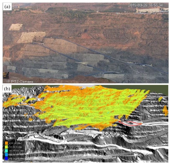 (a) Optical image of the target open pit slope. (b) It is difficult to distinguish the pavement surface from the slope surface using the mapping result generated by nearest-neighbor interpolation. The orange color areas consist of several pixels across multiple slope steps. A ground-based synthetic aperture radar interferometry (GB-InSAR) cumulative deformation map was produced in a month, and was mapped on the terrain model. The orange-colored area shows great deformation but is difficult to interpret by geotechnical engineers.