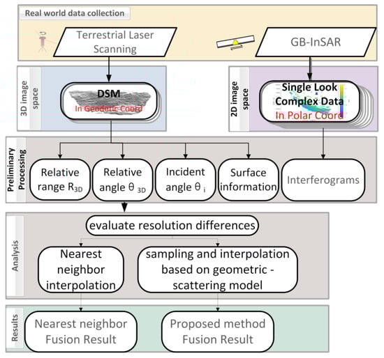 Logical experiment scheme of the data fusion between GB-InSAR interferograms and terrain point cloud data using nearest-neighbor interpolation and geometric-scattering model separately.