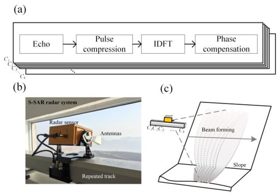 The radar sensor gathered data based on the principle of independent propagation and superposition of electromagnetic waves. The data were coherent after processing. A synthetic-aperture radar is generally an antenna array of N numbers of antennas. The echo signals were received by each antenna and then coherently superimposed. The common GB-InSAR may use an stepped frequency continuous wave (SFCW) signal or linear frequency modulation continuous wave (LFMCW) signal. The SFCW system is easier than the LFMCW to implement, hardware-wise. The linear rail driver adopts the pulse-width modulation (PWM) signal to trigger and control the sliding platform of the linear track "step-by-step and stop". In a single scan from start to end, the original data as-obtained were processed and saved in a complex array. Each element in the array corresponds to a specific location on the rail, allowing the data of a certain frequency band to be obtained. The term “repeat-track”, here, refers to passing the same area repeatedly. In this approach, the system acquired SAR data sets by passing the same area twice, covering it with a slightly different viewing geometry. The imaging geometry of the repeat-track SAR interferometry is shown in Figure 3c. On the first pass, the radar wave was transmitted from the transmitting antenna every 1 s. After interaction with the terrain, the backscattered return was also recorded by receiving antenna every 1 s. The signal was then processed to a complex SAR image, with 2 s on the second pass; the signal was processed to another complex SAR image. The system made repeated observations of specific scenes at different time points to obtain radar images in a time series. The phase changes of the image sequence can be analyzed to obtain high-precision deformation information of the observed scene. The elevation in the monitored scene fluctuates as 2D images were gathered in 3D space. The GB-InSAR used an overhead perspective to monitor unstable slopes.