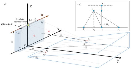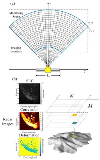 Deformation monitoring can reveal unstable slope surfaces to prevent serious safety hazards. It is deployed to determine changes in the shape and displacements of a deformable body in temporal and spatial domains []. Advancements in signal processing, integrated circuit, microwave, and antenna technologies have made synthetic aperture radar (SAR) a notable innovation in the radar technology field. Interferometry is a technique for extracting deformation information by comparing the observed phases before and after the deformation of an object. SAR interferometry technology can be used for all-weather situations and the high-precision monitoring of ground surface deformations across large areas []. Ground-based synthetic aperture radar interferometry (GB-InSAR) has been tested in various fields in recent years including the monitoring of landslides, open-pit mines, ground subsidence, architectural structures, bridges, sinkholes, and glacier displacements [,,,,,]. Despite these achievements, there are yet obstacles hindering the practical application of GB-InSAR deformation monitoring. Traditional SAR can obtain 2D images in steep and complex terrain, but 3D objects may be severe distorted on the 2D image which obscures several targets [,,]. SAR sensors can resolve different monitored targets based on their slant ranges from the targets to the radar center and the angles away from the centerline of the radar antenna middle beam. Unlike the orthographic projection of a traditional topographic map and the central projection of photogrammetry, SAR-based image projection generally requires manual interpretation to identify a deformed target and its position in the planar coordinate system of a radar image. The interpretation of radar images requires understanding and judgment of radar observation geometry and imaging principles, matching with 3D scenes, and accurately locating deformation areas and variations. The analyst must have sufficient knowledge to ensure appropriate such identifications. The issue of accurately interpreting 3D measurement results is key regarding successful GB-InSAR implementation.