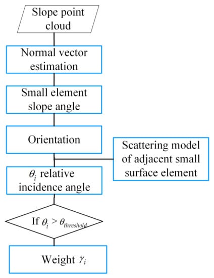 An algorithm flow was established (Figure 7) to explicitly show how to determine the weights assigned to the point cloud by the radar pixel based on the geometric-scattering model. K values need to be set according to the difference in resolution between the point cloud and the radar image. The normal vector can be computed using the method introduced by Hoppe et al. based on the directed distance function (signed short function) of the scattered point cloud the normal vector []. Assuming that the terrain point cloud plane is continuous after sampling, the most similar K adjacent points can be determined for each point p by the k-nearest neighbor classification method, which has been widely used, and as such there is no need to describe it in this paper. The local incident angle can be obtained quickly via Equation (4). The focal point coordinates and the phase center coordinates of the small surface element allow the local incident angle for each small surface element to be computed as: