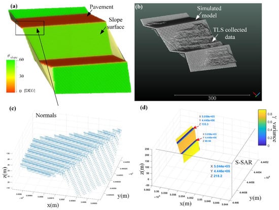 (a) Surface color of the road-slope model indicating variance extracted by Equation (5). (b) Geocoded model with the actual collected terrain point cloud to a local coordinate system via linear transformation. (c) Normal vectors of the pavement and slope of the rectangle. (d) the variance of each point. The deep blue color area is the pavement. In this case, they have a bad incident angle.