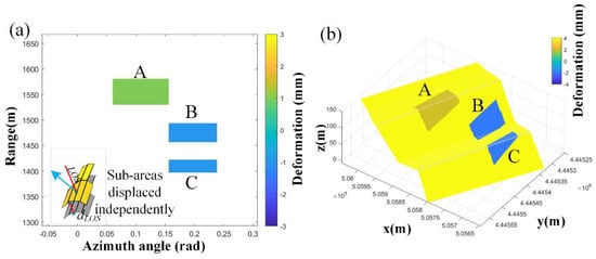 Sub-area deformation positioning: The mapping relation table of the 3D point cloud and radar image was established via geometric mapping. Several subregions were identified in the diagram that are composed of groups of pixels that appear as blocks on the surface. As shown in Figure 9a, these blocks have a global displacement along the LOS direction; this simulates the displacement detected by the radar rather than changes in the 3D model. The simulation results can then be mapped to a 3D space as shown in Figure 9b. This case features sub-area overall deformation. The GB-InSAR image as-collected from the open-pit mine was used to match the real terrain point cloud and simulated terrain point cloud using the method described in Section 2. Several sub-areas that cover the pavement and slope surface were then created as shown in Figure 9a–c were the index of the sub-area. However, in the real world, the deformation of the road surface and slope surface is always different, so simulation case 1 only shows the spatial positioning of each sub-area.