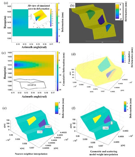 In a strict sense, the weight calculated based on Equation (12) in the paper may not conform to the scattering differences of local areas in any natural scene. However, it is widely used in SAR image simulation. It comes from the hypothesis that the surface is a collection of “small spherical” scatterers. Some scattering model is simulated based on function and a lot of researchers adopt the function to simulate the scattering difference. In addition, if possible, we need to design our own compromise function to accommodate the local geological condition. The factor will affect deformation mapping. For example, the result in Figure 13 shows sudden changes from 40–50 mm to 20–30 mm. The situation may confuse us if the mapping result is correct or near the real deformation. Figure 16a,b is the one radar pixel interpolated deformation surf plot of A and A’ (Figure 13). The figure would help to understand the influences when using a geometric-scattering model.