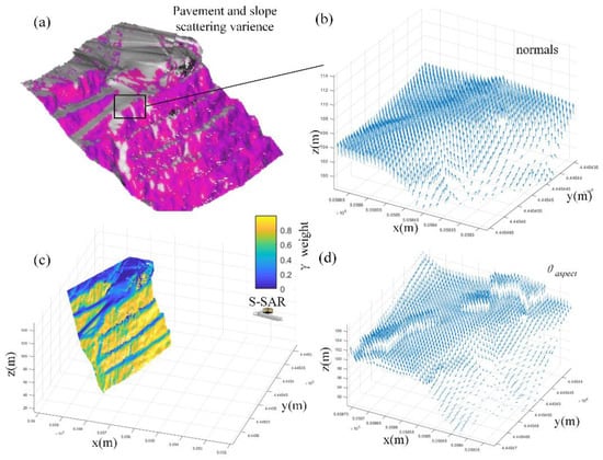 (a) Radar local incident angle and (b) normalized results, local zoom in Figure 11a. The arrow represents the direction of the incident vector (Equation (11)). (c) Weight varies when the scattering model changes. (d) The arrow represents the direction of local most likely deformed by gravitation or explosion fluctuation.