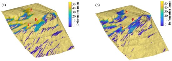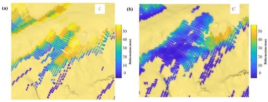 As shown in Figure 15, the areas C and C’ show an area with an undulated surface. The case is quite similar to the road and slope crossing area. These areas are commonly seen in an open pit where roads go two directions, or the roads are a regional rotary; these are often unstable when trucks pass. The abnormal boundary was relieved by the proposed method in the paper. The nearest-neighbor method result is confused by abnormal deformation and the real deformed area is concealed.