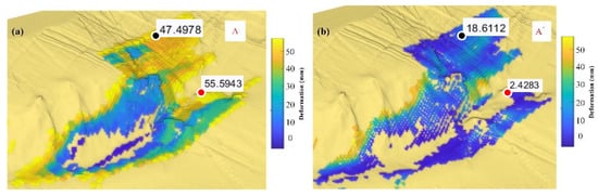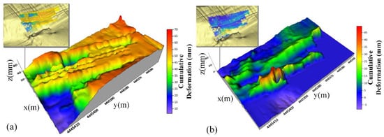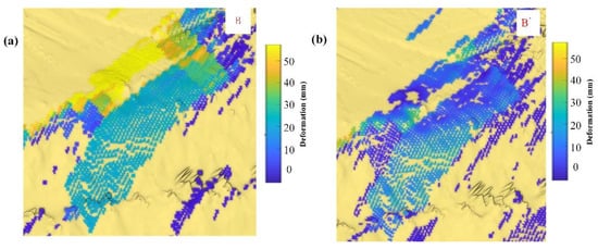 Three sub-areas A, A’, B, B’, C. C’ were selected, corresponding to the simulated step model sub-areas. Area A is as shown in Figure 13a, the bright yellow boundary shows a great deformation, with the highest reach near 56 mm, which is quite large. The situation is quite similar to the controlled field test from in our previous work [], which are abnormal boundaries caused by the persistent scattering points that affect the neighborhood area. The area itself is not in a good coherence situation and the phase error is significant. Then, the deformation extracted in these boundary areas is also abnormal. In the A’ area, as is shown in Figure 13b, the situation is relieved, especially for the pavement areas: For the red point, from 55.5943 mm to 2.4283 mm; for the black point from 47.4978 mm to 18.6112 mm. For the slope area, the real deformation still exists, a geologist can introduce their analysis method for further destruction deduction.