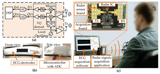 (a) Architecture of the quadrature Doppler radar used for the measurements; (b) Photographs of the Smartex Wearable Wellness System (WWS) used for the electrocardiogram (ECG) measurement; (c) Experiment setup.
