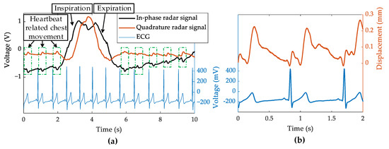 (a) A fragment of the recorded ECG and radar signals. It could be noted that the heartbeats acquired by the ECG amplifier are followed with slight movement patterns picked up by the radar. During the inhale−exhale (see 2–5 s) this movement pattern is distorted. (b) A heartbeat-related chest wall displacement obtained using the extended differentiate and cross-multiply (DACM) demodulation of the first 2 s of the radar signals.