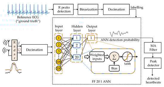 Flowchart for the proposed method for heartbeat detection based on the classical shallow feed-forward neural network with a single hidden layer with 20 neurons (FF 20 1 ANN). The artificial neural network (ANN) input is the 200-sample long vector containing resampled 100 in-phase and 100 quadrature component samples. For the FF 20 1 ANN there are 20 neurons in the single hidden layer and 1 neuron in the output layer. MA Filter—moving average filter.