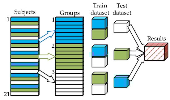 The performance was evaluated using a three-fold cross-validation: the data were split into three equal subject groups (folds), each containing recordings acquired from 7 subjects, out of which two folds were used for training and one for testing. The training and testing were repeated three times for a different fold held out for evaluation (as shown in Figure 6).