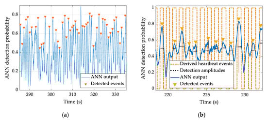 An example of the heartbeat’s method detection. Panel (a) shows the output of the FF 20 1 ANN smoothed with a moving average window, with the detected prominent peaks in a 50 s interval. Panel (b) shows the output of the FF 20 1 ANN smoothed with a moving average window on a shorter time scale plotted against the reference ECG (derived heartbeat events) for an easier visualization of the detected heart events.