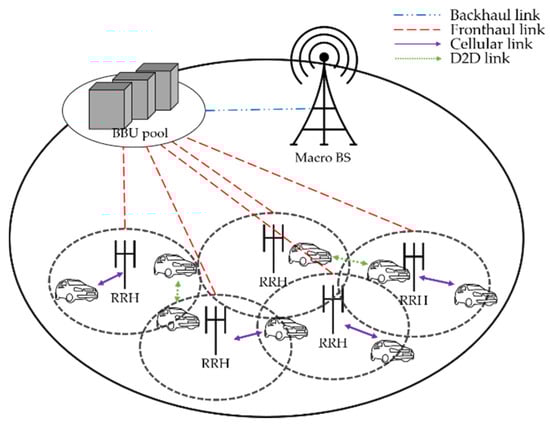 With the dynamic increase in data traffic in connected vehicles and wireless networks, satisfying cellular data traffic has become relevant. To satisfy these requirements, vehicular social networks (VSNs) have been studied [1,2]. VSNs consist of moving and parked vehicles on roads, and the vehicles communicate with nearby vehicles or infrastructure to report and exchange traffic information. Therefore, one of the challenges is to ensure communication quality and reduce delays in VSNs. To guarantee a high data rate in a VSN, base stations are densely deployed and overlapped. However, densely deployed base stations cause higher system energy consumption. To tackle the energy consumption problem, the traditional base station structure is changed to a centralized structure, such as a heterogeneous cloud radio access network (H-CRAN). In the H-CRAN structure, a traditional base station is divided into a signal-processing part as the baseband unit (BBU) and a signal transceiver part as the radio remote head (RRH). The BBUs are centralized as a BBU pool, and the RRHs are connected to the BBU pool through fronthaul links. The macro base station only serves voice services to users, and the RRHs are densely overlapped in macro cells.