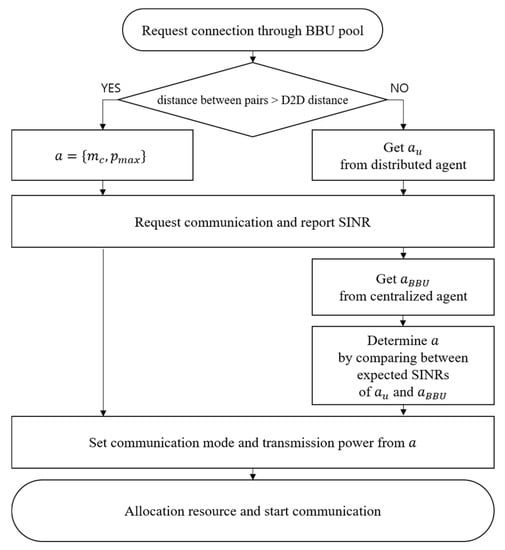 In Step 2, the agent calculates the expected SINRs of the recommended actions from its own agent and from the BBU pool. The agent chooses communication mode and transmission power as its action. The agent then informs the BBU pool of the determined action. The BBU pool allocates resources to the device, and the device starts communication based on the determined actions. This procedure is summarized in Figure 2.