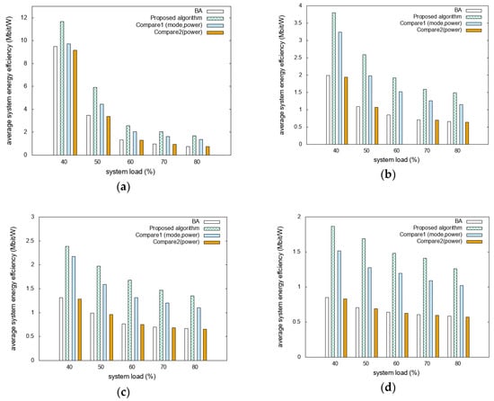 The energy efficiencies for different D2D distance scenarios are compared as functions of the system loads with different mobility scenarios, as shown in Figure 3. Figure 3a shows that the system energy efficiency of the proposed algorithm is 83% and 89% higher than those of BA and Compare2, respectively. Compared to Compare1, it presents high energy efficiency, with a difference of approximately 26%. In Figure 3b it can be seen that the proposed algorithm outperformed BA, Compare1, and Compare2 by more than 121%, 26%, and 126%, respectively. Figure 3c shows that the system energy efficiency of the proposed algorithm is 102% and 108% higher than that of BA and Compare2, respectively. Compared to Compare1, it presents higher energy efficiency, with a difference of approximately 21%. Figure 3d shows that the proposed algorithm performed approximately 128%, 27%, and 133% better than BA, Compare1, and Compare2, respectively. As the number of devices capable of D2D communication increases as the D2D distance increases, the difference in system energy efficiency increases. This is because the devices communicate directly rather than through the RRH, which reduces the system’s energy consumption. The proposed algorithm is designed to maximize system energy efficiency; thus, it gives the best performance in scenarios with large D2D distances. Furthermore, because D2D-mode vehicles communicate with the same transmission power at different distance thresholds, the achievable data rate and system energy efficiency decrease at longer D2D distance thresholds. This reveals that the overall performance decreases as the D2D distance threshold increases, but the proposed algorithm achieves a better performance compared to other algorithms. In addition, system energy efficiencies in the light traffic scenario get higher-scale results than the heavy traffic scenario. This is because vehicles require more resources in the light traffic scenario compared to the same number of vehicles in a heavy traffic scenario. Required resources affect system capacity, so system energy efficiencies in the light traffic scenario are higher than the heavy traffic scenario in the same system load situation.
