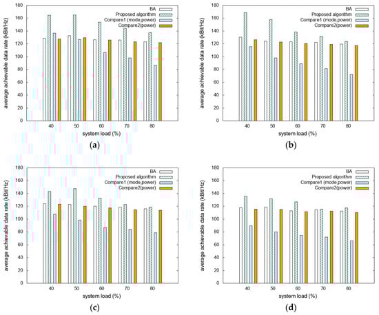 The average achievable data rates for the different D2D distance scenarios are compared as functions of system loads with different mobility scenarios, as shown in Figure 4. Figure 4a shows that the proposed algorithm has achievable data rates that are higher than those of BA, Compare1, and Compare2 by approximately 20%, 40%, and 22%, respectively. Figure 4b shows that the achievable data rate of the proposed algorithm is 60% higher than that of Compare1. Compared to BA and Compare2, it presents higher energy efficiency, with differences of approximately 16% and 19%, respectively. In Figure 4c, the proposed algorithm presents approximately 10%, 47%, and 13% higher achievable data rates compared to those of BA, Compare1, and Compare2, respectively. Figure 4d shows that the proposed algorithm outperforms BA, Compare1, and Compare2 by approximately 9%, 65%, and 11%, respectively. As the D2D distance increases, increasing the D2D communication ratio results in reduced energy consumption. However, increasing the D2D distance decreases the achievable data rates because the D2D mode communicates with the same transmission power even in degraded interference situations. In addition, communication without mode-selection algorithms, such as BA and Compare2, can select the transmission mode by simply considering the expected SINR, so it can perform better in terms of achievable data rate than algorithms with mode selection. The proposed algorithm achieved a higher achievable data rate even in such scenarios by adjusting the target SINR.