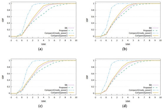 The cumulative distribution functions (CDFs) of SINR received by vehicles for different D2D distance thresholds are compared in Figure 5. Figure 5a–d shows the distribution of the received SINR in each algorithm. In all panels, the proposed algorithm has more vehicles that receive higher SINR compared to BA, Compare1, and Compare2. The proposed algorithm and Compare1 can select the communication mode and transmission power to maximize the system energy efficiency, allowing vehicles to select more D2D modes. It can increase spectral efficiency and reduce system energy consumption, but it can also decrease the received SINR. However, the proposed algorithm is designed to select the mode and transmission power to ensure the received SINR. Therefore, the proposed algorithm has more vehicles, receives higher SINR, and performs better with an achievable data rate compared to Compare1. The BA and Compare2 decide the communication mode based only on the expected SINR of the vehicle, so they can achieve higher performance in a longer D2D distance threshold.