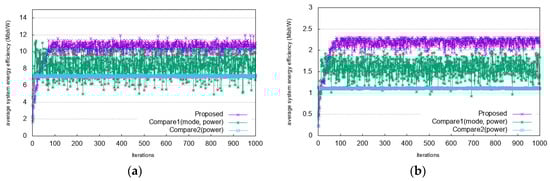 The comparisons of system energy efficiency as a reward function with an increasing number of learning iterations are shown in Figure 6. In Figure 6a it can be seen that as the number of learning iterations increases, the value of system energy efficiency stabilizes after 100 iterations. In heavy traffic scenario, as shown in Figure 6b, the value of the system energy efficiency stabilizes after 100 iterations. The system energy efficiency is overserved with a low value at the beginning of the learning iterations and increases until it reaches a stable point. This means that the proposed algorithm updates its policy optimally and converges faster and in a more stable manner than the other algorithms. The convergence time of the proposed algorithm is longer than those of Compare1 and Compare2. This is because the proposed algorithm has longer decision process and considers more states in decision process. It finally decides an action by comparing two recommended actions. In addition, it considers available resources and interference level as state to make a decision. However, Compare1 and Compare2 consider only interference level as state. Although the convergence time of the proposed algorithm becomes a little bit longer, the proposed algorithm shows better performance in terms of system energy efficiency.