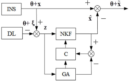 In order to compensate for the INS errors, these errors should first be evaluated. Estimation of errors of INS is carried out using estimation algorithms [], and one of the most common methods is the Kalman filter. Taking nonlinear components into account, the nonlinear Kalman filter (NKF) is used to estimate the INS errors. However, the INS error model in the NKF may not be adequate for the actual process of the changing the INS errors, especially when performing UUV maneuvers. Thus, the identification of the INS error model in the NKF should be considered.