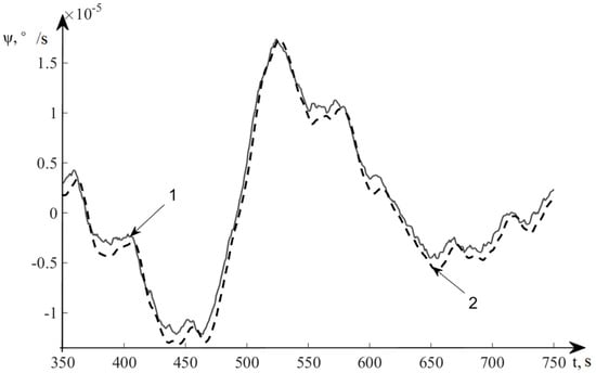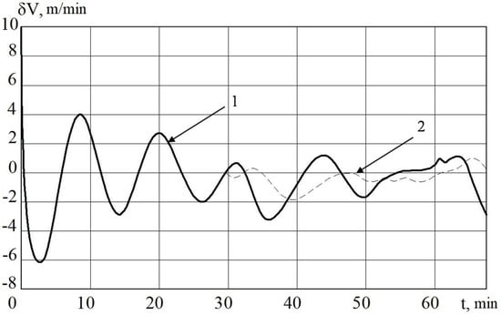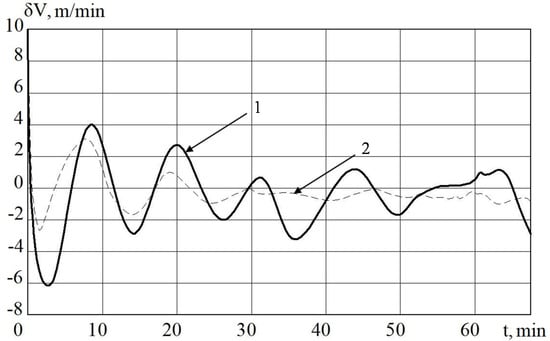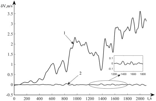 Figure 6 and Figure 7 show the results of modeling the INS error in autonomous mode and with correction obtained by the control algorithm. Line 1 represents the error of INS in determining the speed in autonomous mode (without correction), and line 2 shows the INS error in determining the velocity after correction using the developed nonlinear control algorithm.