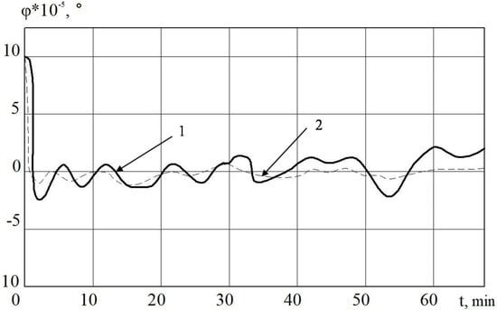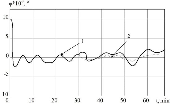 The deviation angle of the gyro-stabilized platform (GSP) in INS from the horizon plane when using MC with a regulator (1) and a non-linear regulator (2).