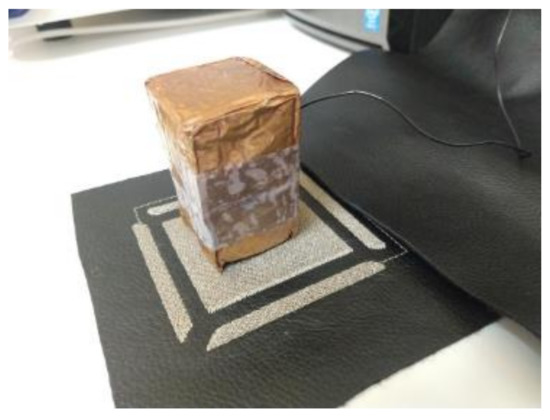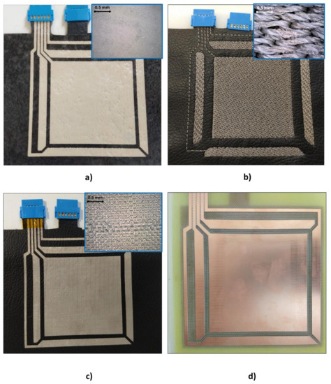 Direct application of conductive textiles technology (Figure 4c): The textile conductor Shieldex® Zell was placed on a MACbond 0.5 mil PET double-sided coated adhesive tape from MACTAC. A desktop cutting machine Cameo3 from SILHOUETTE was used to make the pattern cut. Subsequently, the different parts of the electrode were peeled off and adhered to the fabric using the other adhesive side of the film.