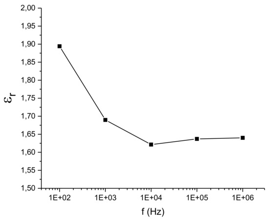 The relative permittivity allows one to calculate the expected theoretical value of the associated capacities. The edge effect capacitance value (Cedge) has been taken as the theoretical value since it considers the effect of the field lines around the edges of the capacitor. It is estimated using Equations (1) and (2):