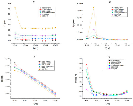 The capacitance values were measured with the same equipment but in mode Cp-Rp (parallel capacitance and resistance) and Z-d (impedance and phase). The capacitance measurements were taken at three different parts of the fabric with a 9-frequency scan (0.1 kHz, 0.5 kHz, 1 kHz, 5 kHz, 10 kHz, 50 kHz, 100 kHz, 500 kHz and 100 kHz).