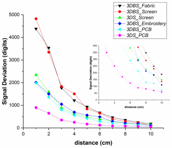 Figure 8 shows a representation of the sensitivity in terms of the signal deviation. Microchip references the signal deviation obtained in MGC3XXX with respect to the distance of the hand compared with the width of the Rx electrodes. The 3DBS_Screen and 3DBS_Fabric sensors present the best sensitivity with similar capacitances to the 3DBS_Embroidery and 3DBS_PCB sensors. The difference may be due to the fact that in the latter, the CTxGND is greater. The standard version, 3DS_Screen, presents a similar sensitivity to the 3DBS_Embroidery and 3DBS_PCB sensors. However, the 3DS_Screen design manufacturing needs one more layer, which is a disadvantage, despite having similar capacitances. Another factor to consider is that the boosted sensor uses a Tx output voltage increasing the amplitude up to 18 V. As expected, the PCB standard version presents the lowest sensitivity.