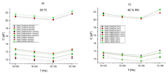 (a) Capacitance variation depending on the humidity at a fixed temperature of 20 °C; (b) capacitance variation depending on the temperature at a fixed humidity of 40% RH.