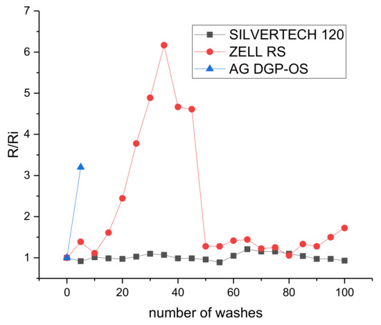 Finally, a study of the variation in conductivity versus washing processes has been carried out. The characteristics of the wash have been one hour of delicate wash at 30 °C with a spin cycle of 700 rpm. Figure 11 shows the result of the normalized resistance variation, from initial resistance value, in a conductor pattern used in the three technologies (fabric, thread and ink).