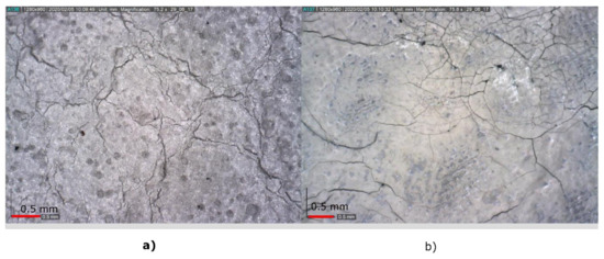 (a) Appearance of the silver ink coated with a heat-sealed film before washing and (b) after 5 washes. The bubbles generated between the substrate and the film and the degeneration of the silver ink are observed.