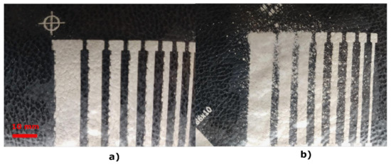 Screen-printing technology (Figure 4a): as previously mentioned, screen-printing technology uses a mesh to transfer ink onto a substrate, openings in the screen defining the pattern that will be printed on the substrate. The rest of the screen is made impermeable to the ink by a blocking stencil. The thickness of the screen, among other parameters, defines the final thickness of the ink. When screen-printing technology is used, it is necessary to manufacture frames with the screen mesh for the design. The screen for the conductors was a 230-mesh polyester material (PET 1500 90/230-48 from Sefar). Afterwards, to transfer the pattern to a screen mesh, a UV film Dirasol 132 from Fujifilm was used. The final screen thickness was 74 μm for the screen for conductors. The patterns were transferred to the screen by using a UV light source unit IC-5000 from BCB. Printing was carried out by using E2XL from EKRA screen-printer with a shore 75° hardness squeegee, 60° squeegee angle, 1 mm snap-off, 3.5 bar force and 100 mm/s. After the deposition of the inks, these were cured in an air oven FED-115 from BINDER at 130° C for 15 min.