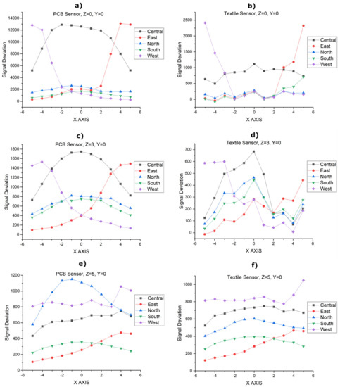 For the characterization of the sensors, the following protocol has been established. An artificial hand has been placed at different positions on the X-, Y- and Z-axis with respect to the center of the sensor. For each position, the signal deviation data provided by the device has been registered. For the sake of simplicity, only the measurements taken from the PCB sensor and the screen-printed sensor (3DBS_Screen) are shown in Figure 14. It shows the curves obtained by moving the artificial hand in the X-axis in the [–5 cm, 5 cm] interval in 1 cm steps for the following values of Z: 1 cm, 3 cm and 5 cm. In all cases, the value of Y = 0.