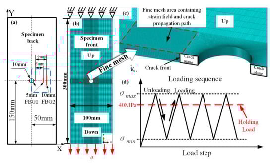 First, the finite element model of specimen is created using ABAQUS software. The placement position of FBG sensors, the three-dimensional model of the specimen, and the fine mesh are shown in Figure 1. The boundary condition is that the top is fixed and the bottom is loaded, as shown in Figure 1b. In order to make the fatigue crack in the stable crack growth region, the stress intensity factor () and stress () for the specimen are calculated by NASGRO database (v8.01, Southwest Research Institute® (SwRI), San Antonio, TX, USA). Simultaneously, the result of the NASGRO database is basically consistent with the stress intensity factors () calculated by FEM under 50 MPa loading. Thus, the load amplitude and the stress ratio were set to 50 MPa and 0.1, respectively. Bergara A et al. [] used an 8-noded hexahedrons element with reduced integration (C3D8R) as the unit type to successfully simulate crack propagation in the complex structures front. The C3D8R is used for three-dimensional model, and fine mesh is used for the fatigue crack propagation path and strain field of crack tip, as shown in Figure 1c. The size of refined mesh is . Furthermore, one workstation (Intel CPU 2.30 GHz X24 and 64 GB RAM) is used for numerical simulation. In order to ensure that the future experimental data is obtained under constant stress, and avoid crack retardation and crack arrest [] behavior caused by high holding load, the holding load was set to 40 MPa. The cyclic loading sequence of the finite element simulation is shown in Figure 1d.