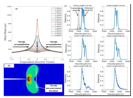 The undeformed reflection spectrum of FBG1 is simulated to compare with its deformed spectrum, as shown in Figure 2c. The central wavelength of the undeformed reflection spectrum is 1550 nm. With the crack growth, the reflection spectrum shifts to the long wavelength direction, and spectral distortion occurs, including spectral broadening and multi-peak appearance. Moreover, the non-uniform strain field also leads to the reduction of peak reflected power. Therefore, this phenomenon is consistent with the above theoretical analysis, which also leads to the change of spectral area. The quantitative study of spectral area is given in Section 2.3.