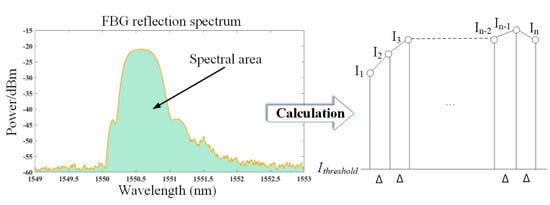 Figure 3 shows the schematic diagram of the spectral area calculation method. In fact, the reflection spectrum acquired by the interrogator consists of many discrete points. These discrete points can be defined as , and the sampling interval is .