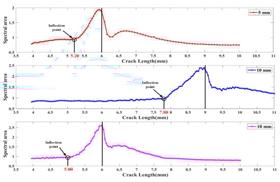 Thirdly, the performance of the spectral area for crack location detection is studied based on simulated and experimental results. The studies show that a significant inflection point appears in the spectral area with crack propagation. The location detection of fatigue crack damage can be performed by identifying the position of the inflection point.