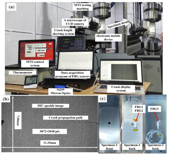 An experiment platform for fatigue crack damage monitoring based on FBG sensors and the DIC method was built, which included a fatigue cycle loading system, crack measurement system, DIC processing system, and an FBG sensors data acquisition system, as shown in Figure 5a. The top of the specimen is fixed, the bottom is loaded, and the constant amplitude loadings (the maximum tensile is 5 kN and stress ratio is 0.1) with a frequency of 10 Hz by the hydraulic MTS testing machine. The crack measurement system can display the crack propagation path and measure the crack length, as shown in Figure 5a.