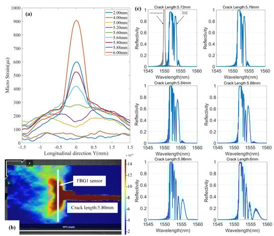 The purpose of the fatigue crack growth experiment based on DIC method is to measure the strain information in the FBG sensors placement position. The principle of DIC method is to track the same subsets between two images captured the reference images (undeformed images) and current images (deformed images) []. The full-field strain measurement method overcomes the defect that the traditional strain gauge can only measure the average strain along grating. Figure 7a presents the strain distribution along the FBG1 grating under different crack lengths. At a crack length of 5.80 mm in Figure 7a, the strain distribution measured by DIC method is shown in Figure 7b. Under the condition of different crack length, the strain loadings along the grating reveals the stress concentration at the crack tip of specimen with a hole. Moreover, the “butterfly shape” at the crack tip is shown in the experimental results (Figure 7b), which accords with “Von Mises” criterion. Figure 7b gives the schematic diagram of the FBG1 placement position, which provides support for the analysis of the influence of longitudinal strain field on FBG. Furthermore, the strain loadings sensed by the FBG1 sensor were approximately uniform, while the crack tip was far from the FBG1. The non-uniform strain loadings with high strain gradient were gradually sensed by the FBG1 sensor with the crack propagation. Moreover, the strain measured using the DIC method in Figure 7a has approximate strain values to the numerical results with the same crack lengths in Figure 2a. Figure 7c shows that the reflected spectra were obtained through the fatigue crack propagation experiment.
