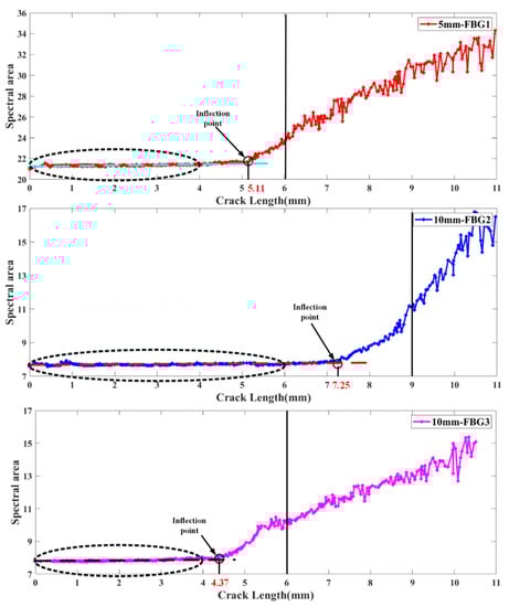 The spectral area of these reflection spectra obtained from fatigue crack growth experiments were calculated to detect the location of fatigue crack damage. The calculation results of the spectral areas of FBG1, FBG2 and FBG3 with crack propagation are shown in Figure 8. First, when the crack tip is far away from the FBG sensors, these spectral areas hardly change, which is consistent with the results calculated from the simulated spectra. This shows that the spectral area is hardly affected by uniform strain and external loading, because the strain gradients sensed by FBG sensors are not large enough. Then, the values of the spectral areas were fitted linearly with crack lengths of 1 mm–4 mm (for FBG1 and FBG3) or 1 mm–6 mm (for FBG2). The point was defined as the “inflection point”, which met the following two conditions: (1) near the fitting curve; (2) an obvious upward trend after the point. As the crack tip approaches the FBG sensor, the result of the spectral area shows a significant inflection point, as shown in Figure 8. A similar inflection point also appears in Figure 4. This shows that the non-uniform strain has a greater impact on the spectral area. After that, the spectral area monotonically increases. However, the simulated spectral area tends to decrease after the crack tip passes through the FBG sensors. This is mainly because the fiber grating is stretched due to the crack opening displacement during the experiment. Moreover, the distance from the inflection point to the FBG sensor placement position is defined as “critical detection range”. The critical detection ranges of FBG1, FBG2, and FBG3 are 0.89 mm, 1.75 mm, and 1.63 mm, respectively. Compared with FBG1, these spectral area of FBG2 and FBG3 present the larger critical range for crack damage. In addition, when the spectral area of FBG1 gradually increases, the spectral area of FBG2 does not change concurrently, which proves the robustness of the spectral area to experimental noise. Therefore, spectral area is insensitive to external load and uniform strain, sensitive to non-uniform strain and robust to noise. The spectral area can be used as a reliable and sensitive detection index for crack location under experimental complex strain fields and noise interference.